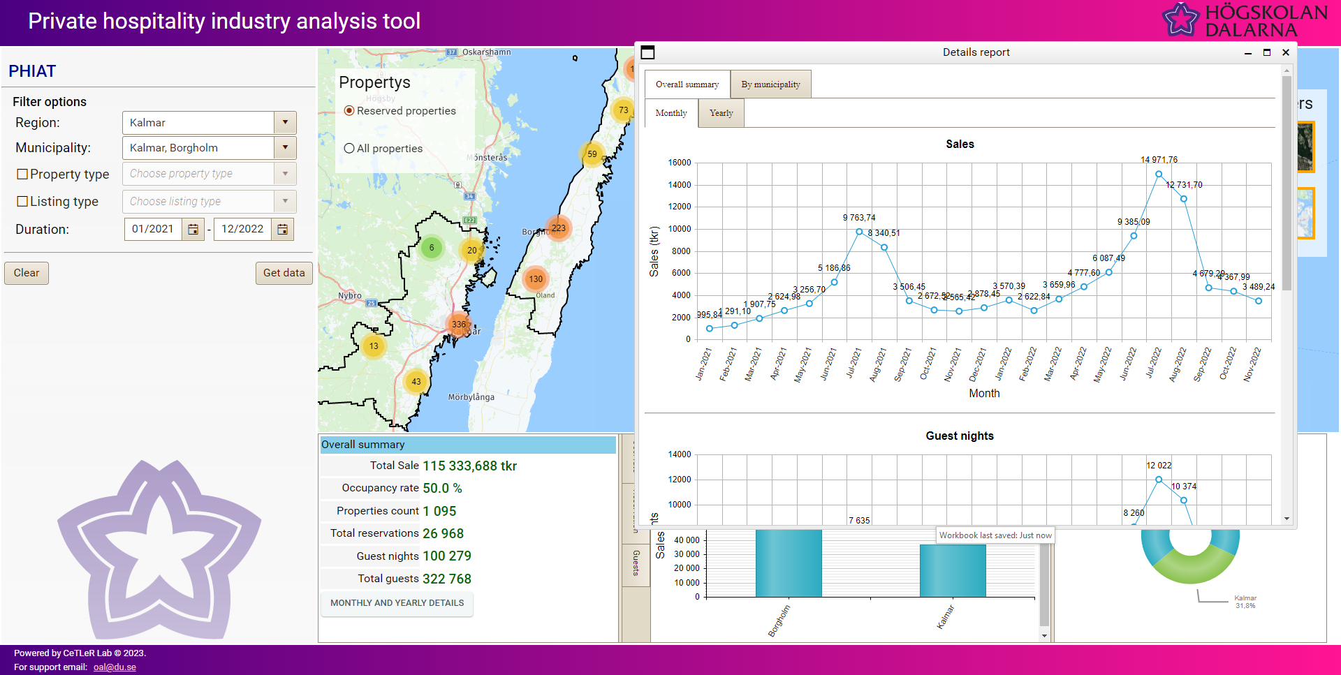 The tool provides a yearly and monthly overall analysis of the selected municipalities, and individual analyses for each selected municipality: