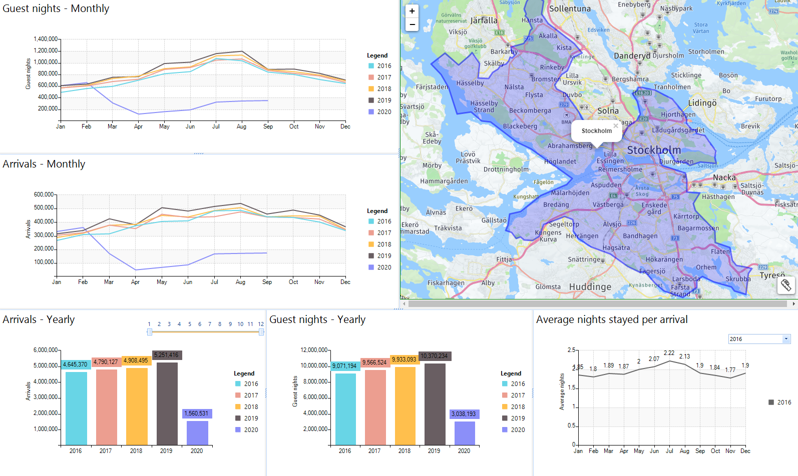 Analytics tool leveraging data from hotels and sewage systems to offer valuable insights into tourism activity. By amalgamating information from these diverse sources, the tool facilitates analysis at the municipality level, providing key metrics such as guest nights, guest arrivals, and average booked nights per arrival