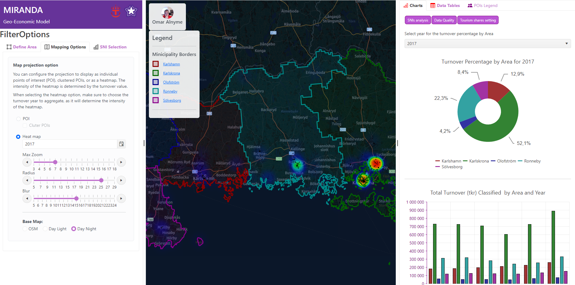 In addition, it provides key metrics like total turnover, employee count, growth rates, and revenue per employee for the selected areas, enabling a comprehensive evaluation of the local economy.