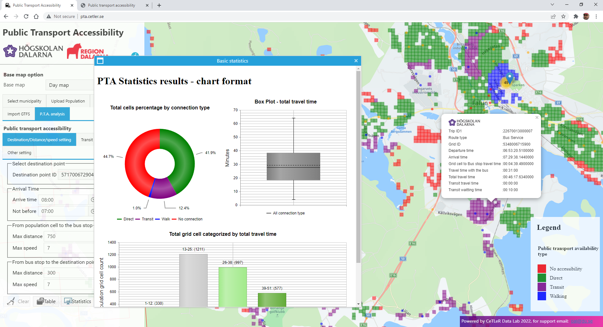 This tool utilizes unsupervised machine learning to identify population grid cells capable of reaching specific destinations within predefined time frames. Each grid cell is enriched with essential information, including arrival and departure times to the destination, travel times to the nearest bus stop, bus travel times to the destination's closest stop, and journey details such as trip ID, route ID, and trip type (direct or transit).